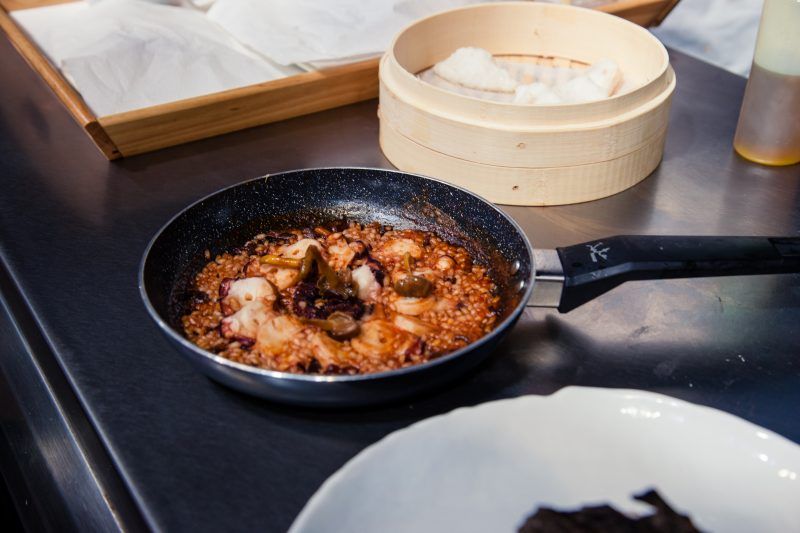 Mari Carmen Vélez ha cocinado sus tres platos usando diferentes técnicas para cada uno de ellos. Con el fin de presentar las texturas de estos cefalópodos en el contexto de los arroces secos, Veléz se ha apoyado en tres instrumentos diferentes para cocinarlos: una sartén, un cazo y la tradicional paella. A su vez, utilizando un ingrediente clave en la dieta mediterránea y acompañándolo de productos de primera calidad, Mari Carmen ha deleitado al público gourmet con su ponencia, que ha comenzado en torno a las 15:00 horas del lunes 11 de noviembre.  El objetivo de esta «Aula del Arroz Valencia D.O» era abrir un diálogo entre la cocina de vanguardia, las recetas dulces, las tradicionales y las internacionales.